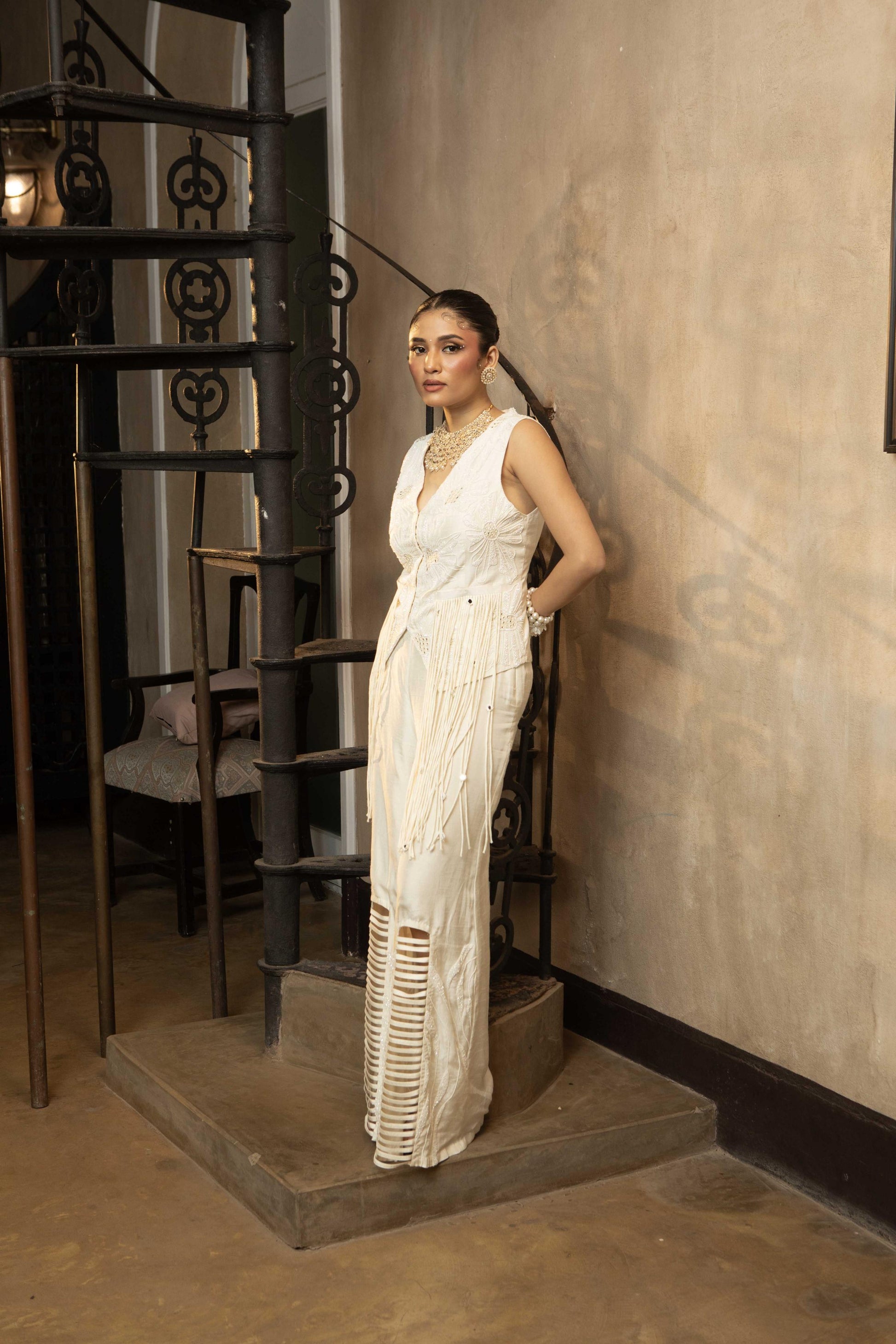 Embroidered longline vest paired with flared pants featuring distinctive slit details.