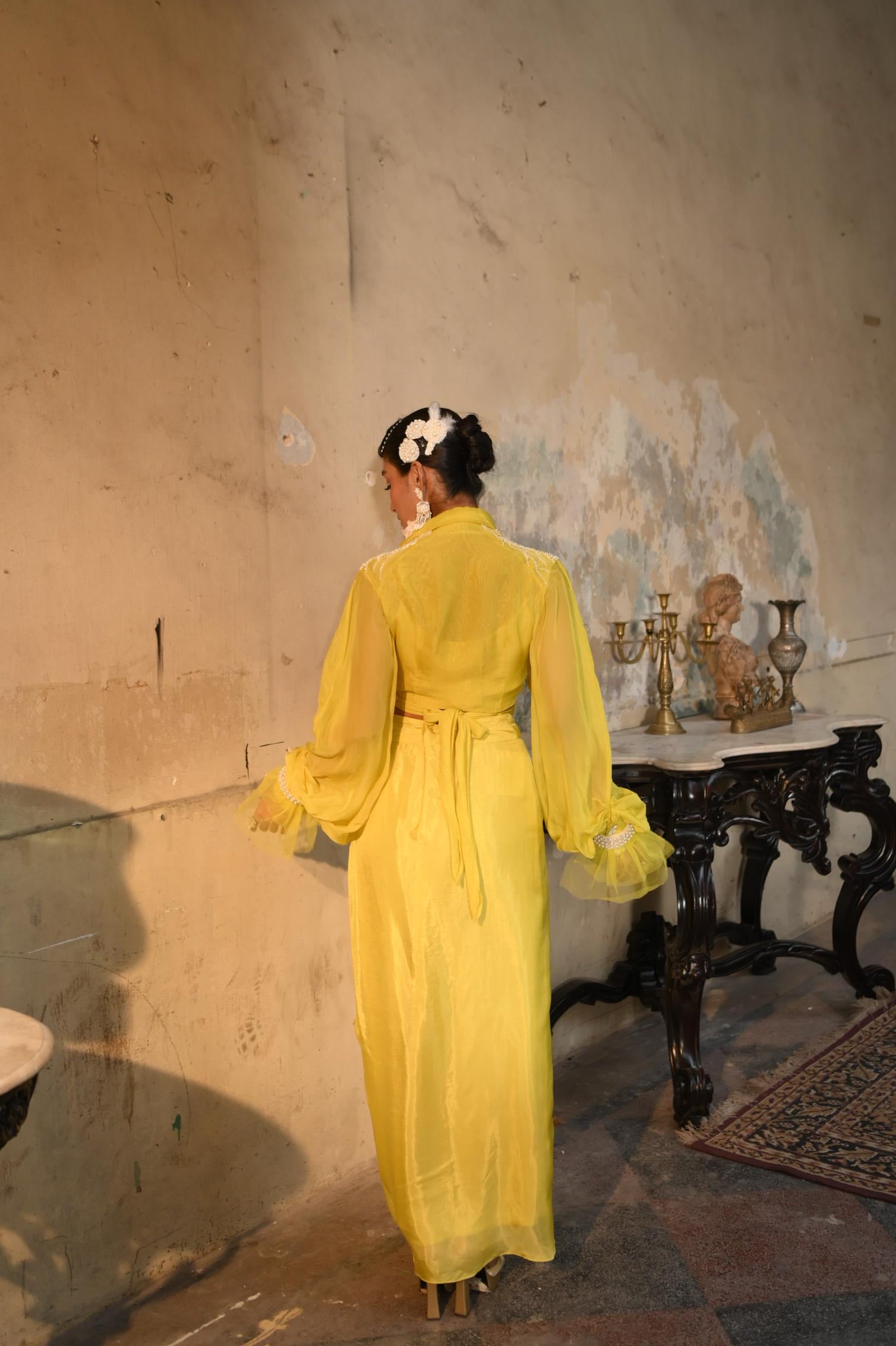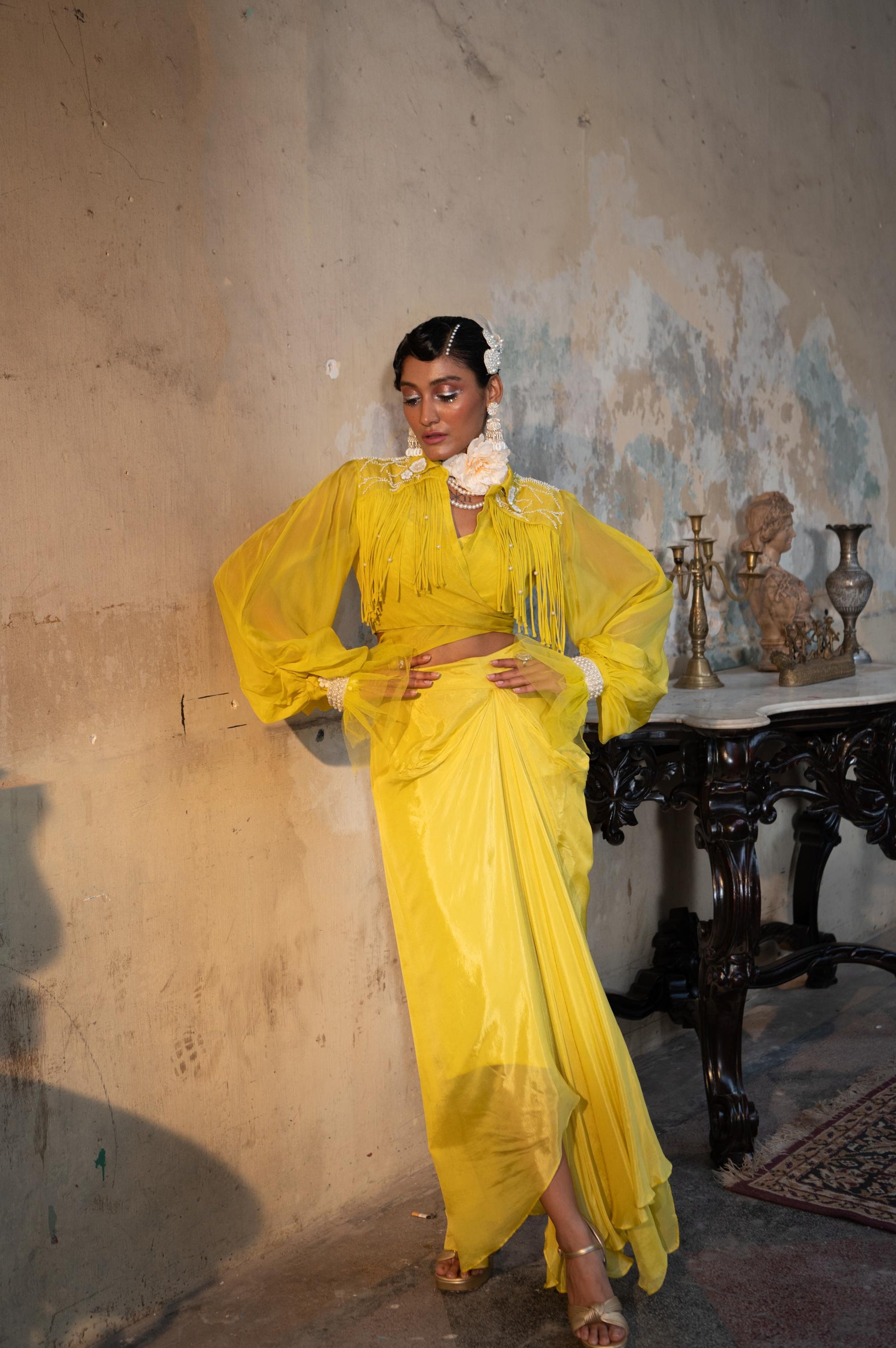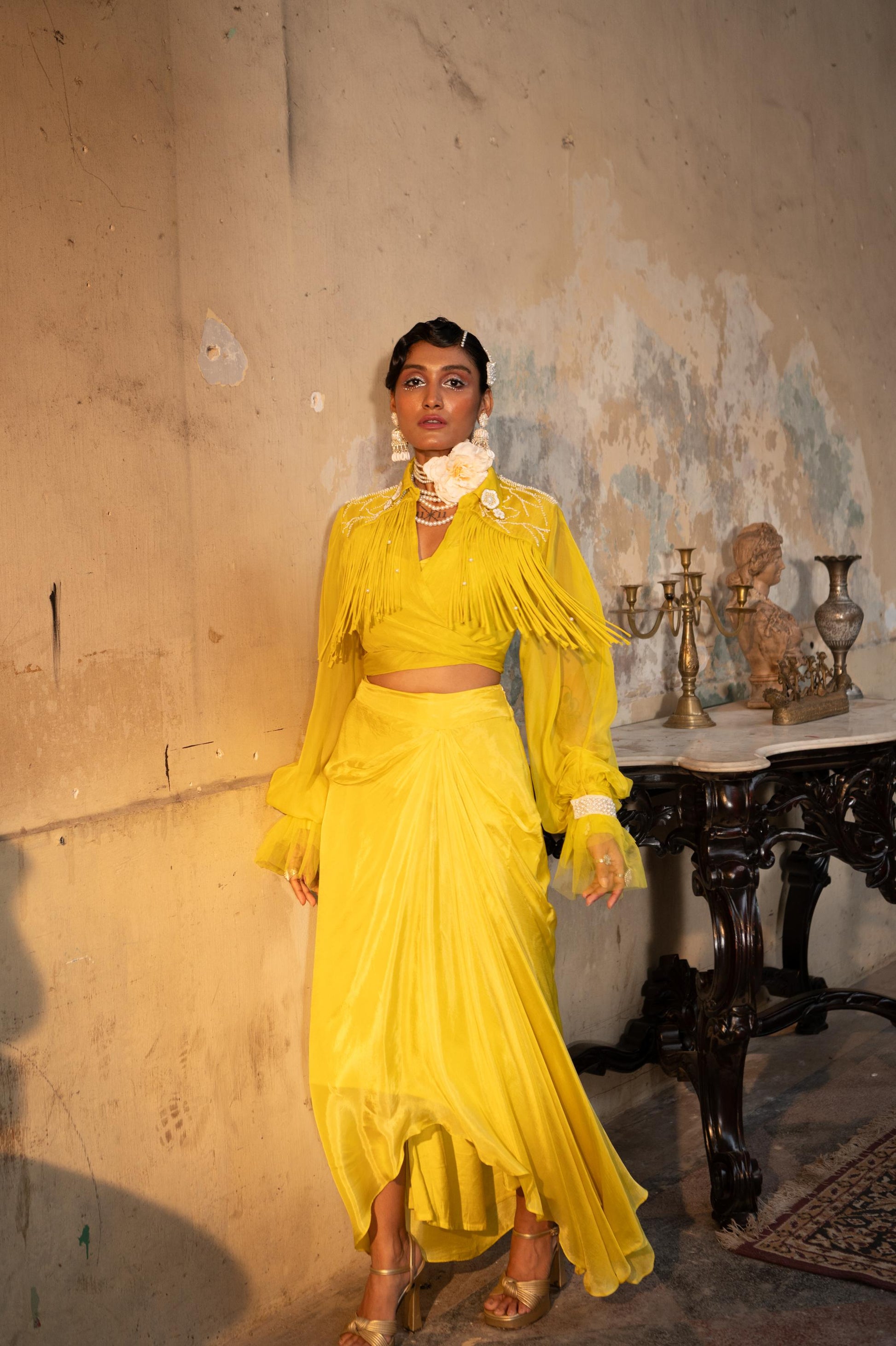 Dramatic sleeve crop Shirt with bustier paired with draped skirt.