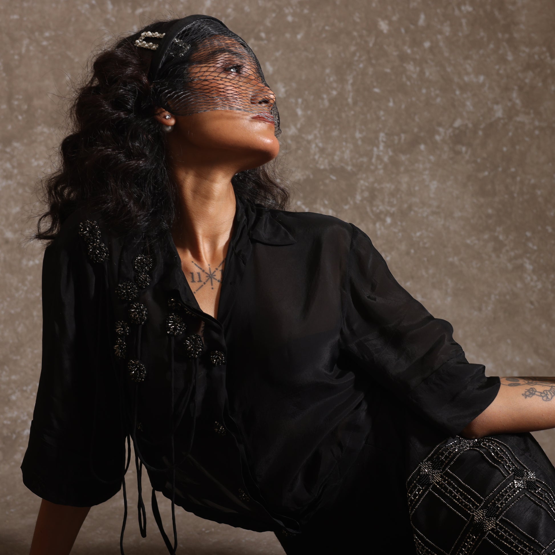 Embellished Oversized Sheer Shirt with Bustier and Embroidered Box Shorts