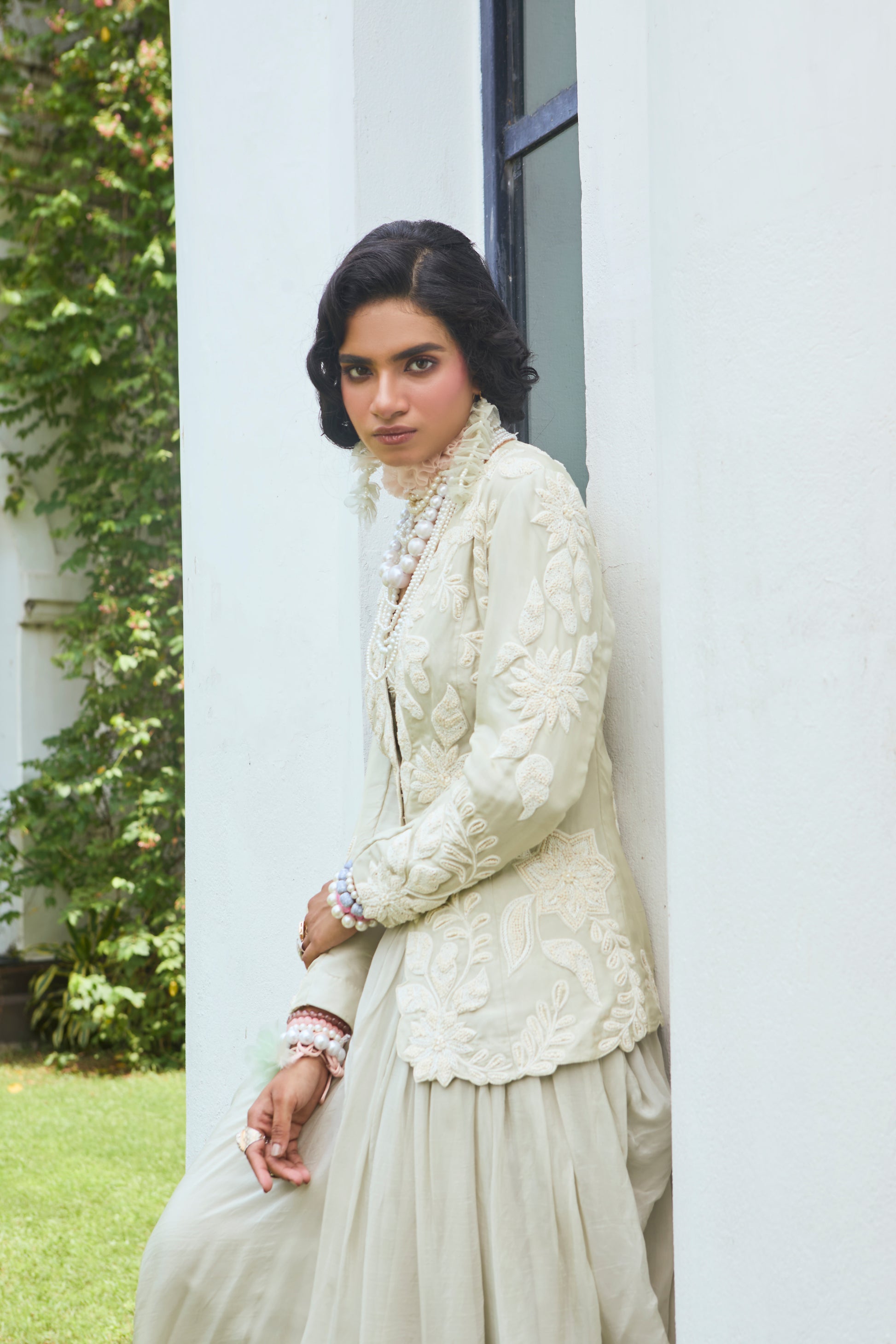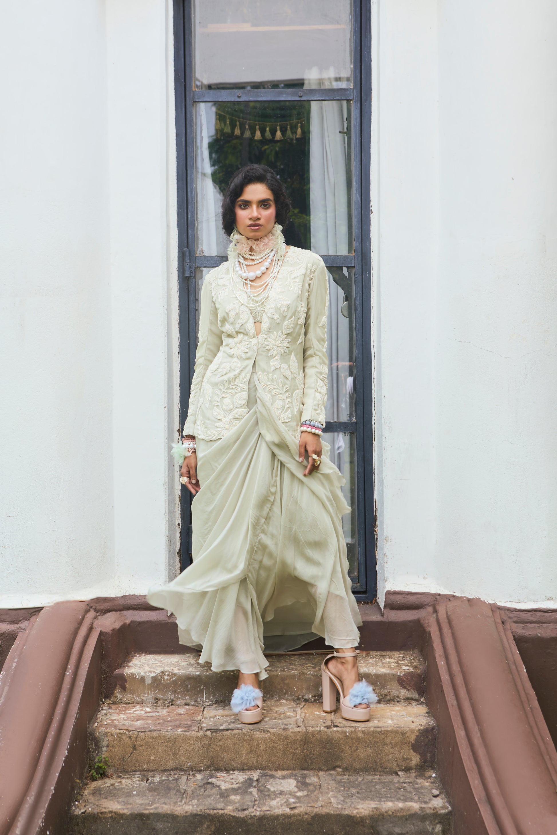 Embroidered Longline Jacket With Bustier & Draped Skirt