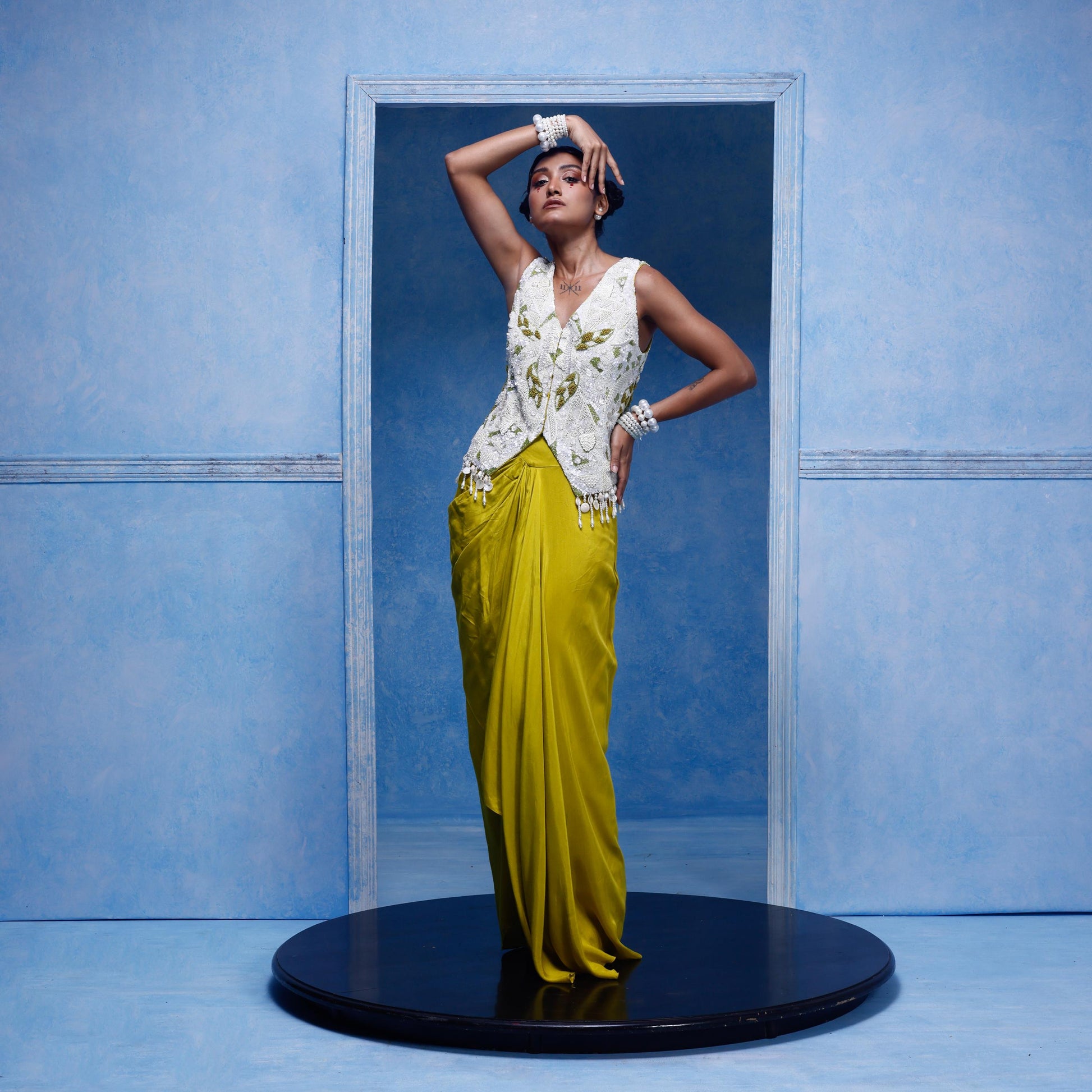 Embroidered sleeveless jacket paired with elegantly sculpted drape skirt.