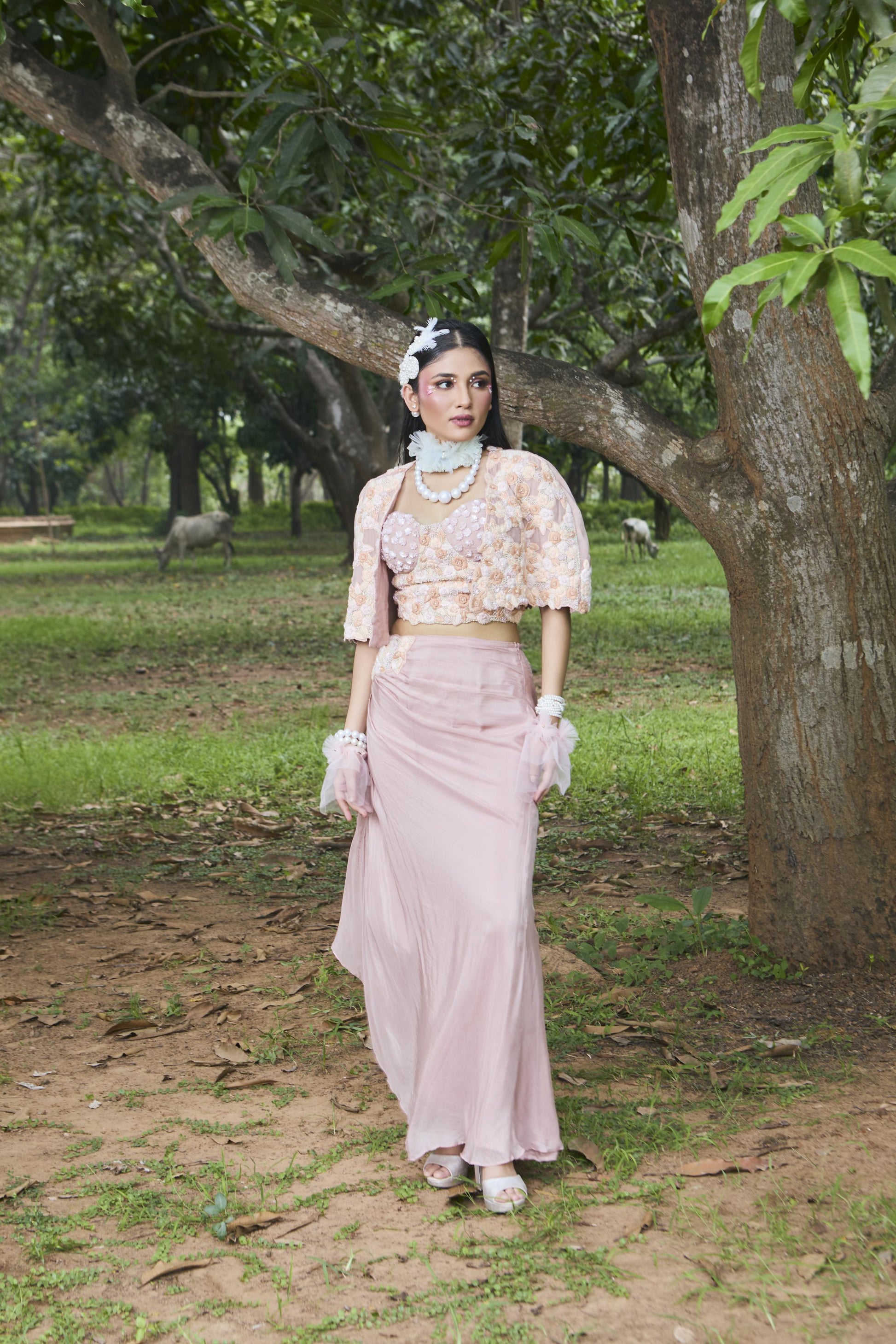 Floral embroidered cape and blouse paired with a pickup skirt.