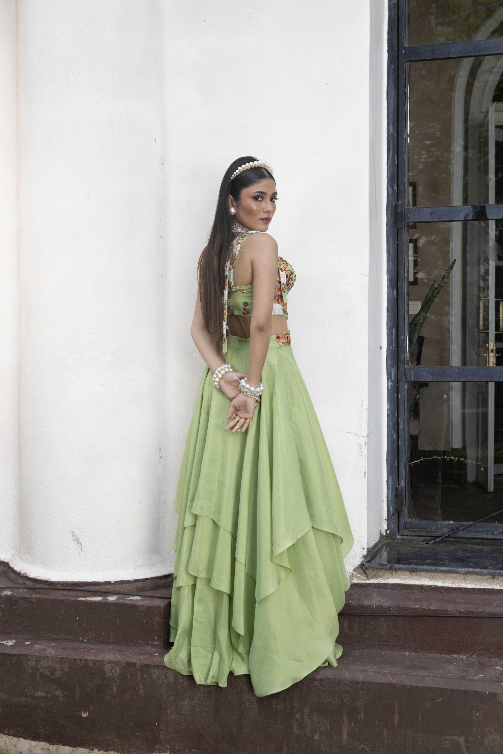 Garden-inspired sleeveless blouse paired with a multi-tiered fluid skirt.