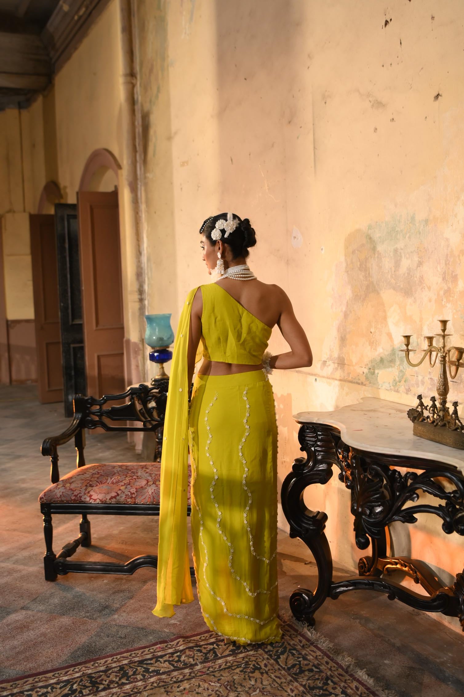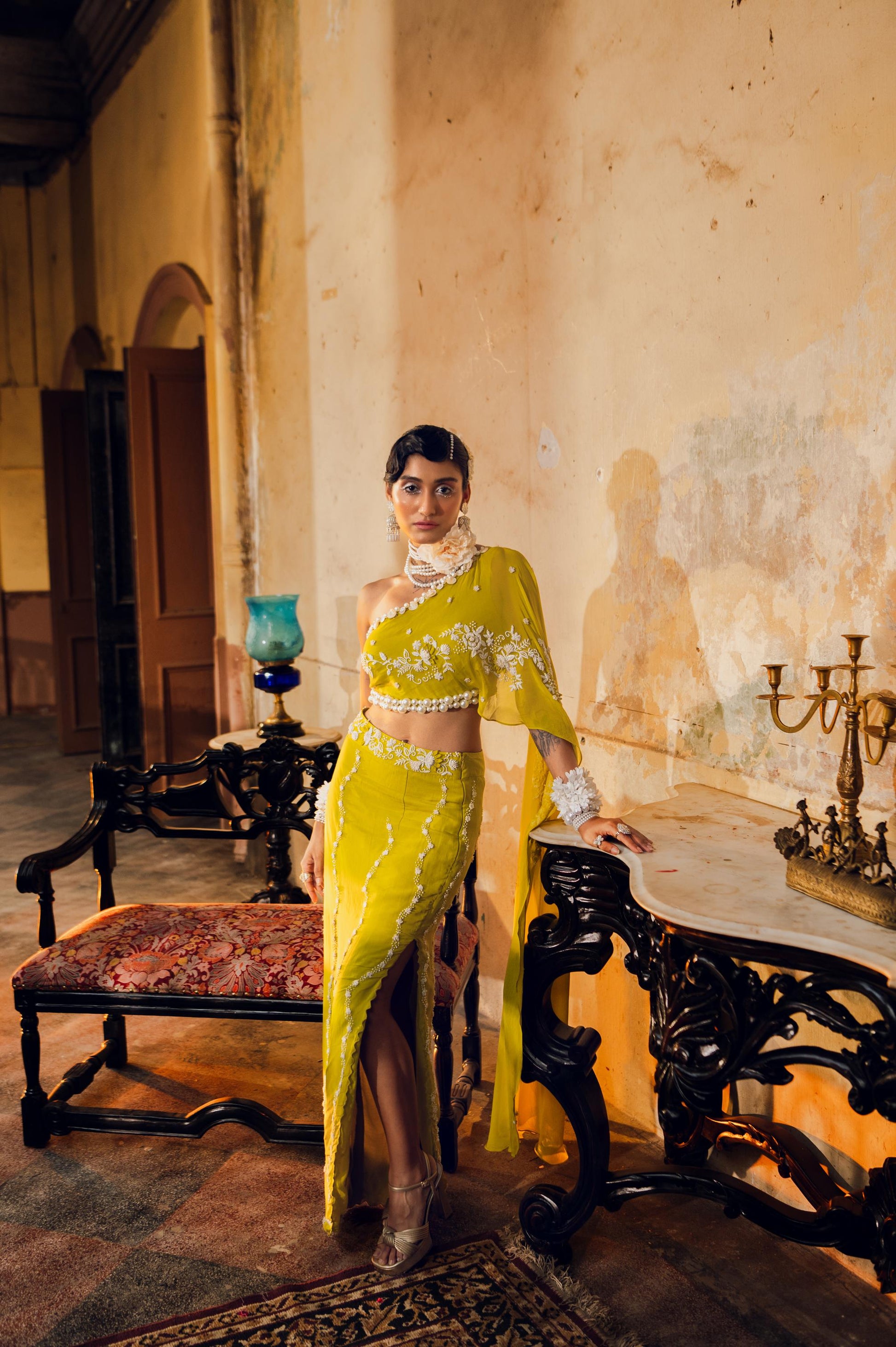 One-shoulder embellished top paired with a side-slit skirt