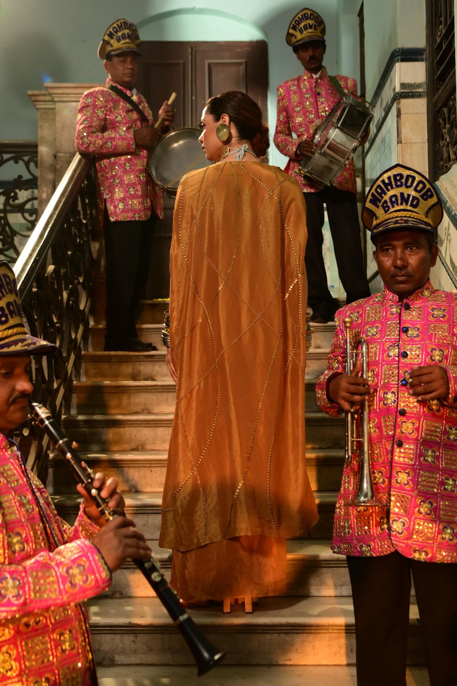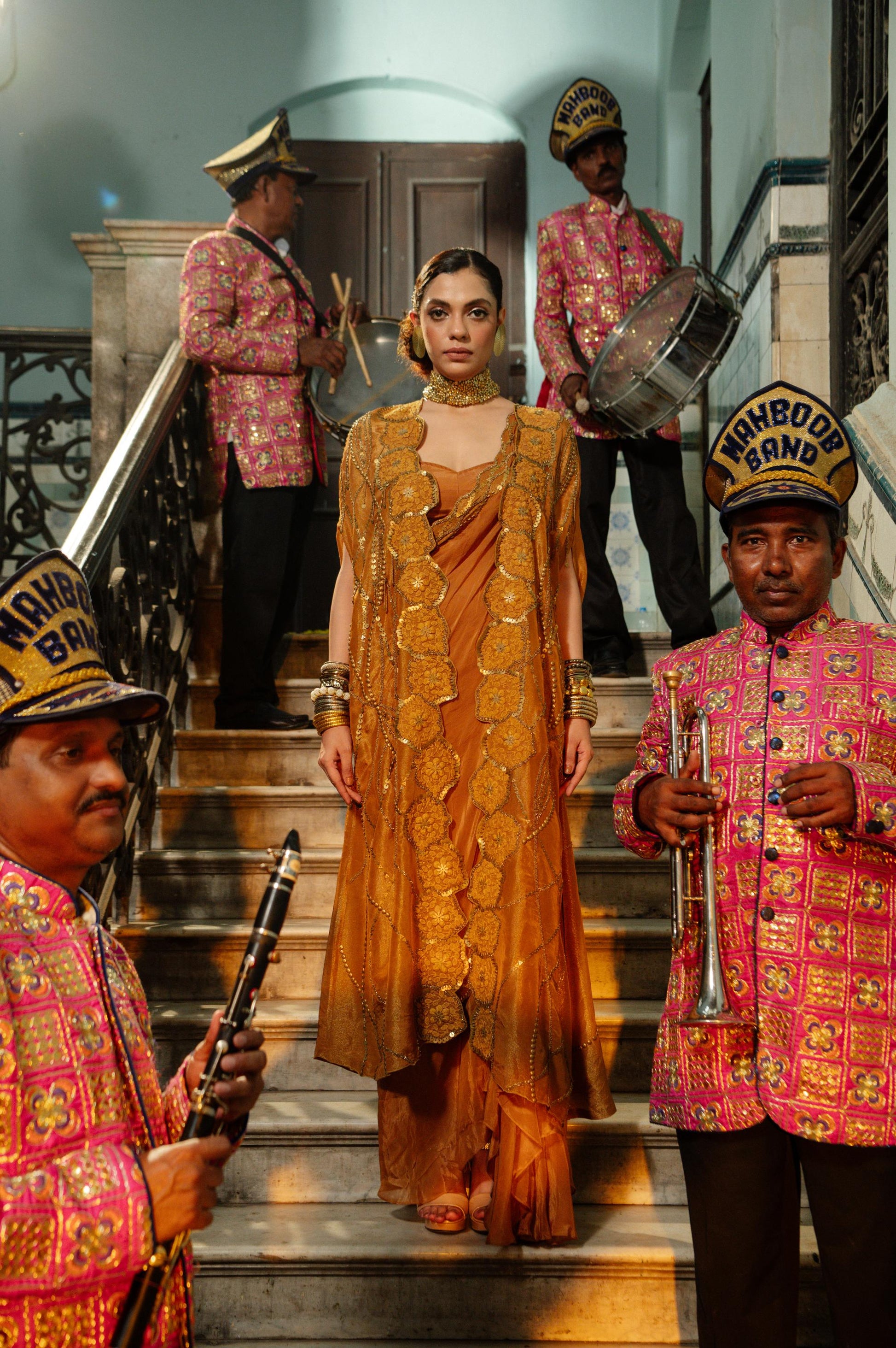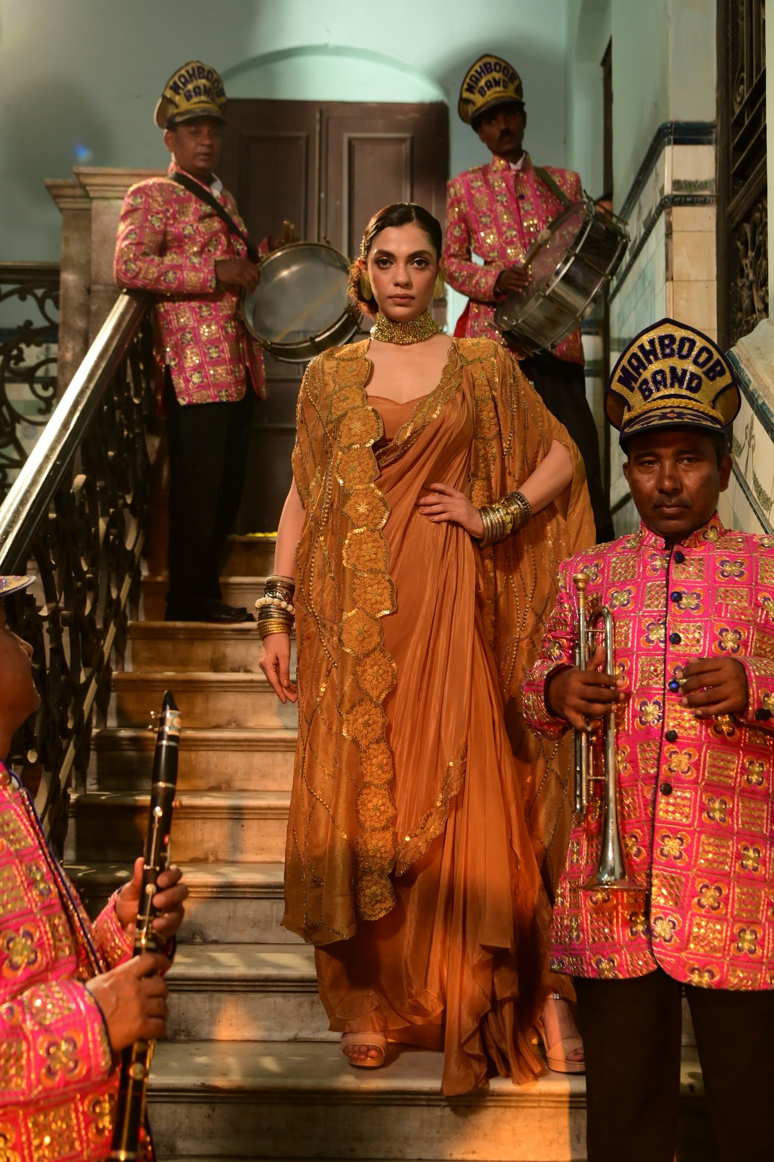 An embellished longline cape with a fitted bustier, paired with a flowing drape and a pick-up skirt