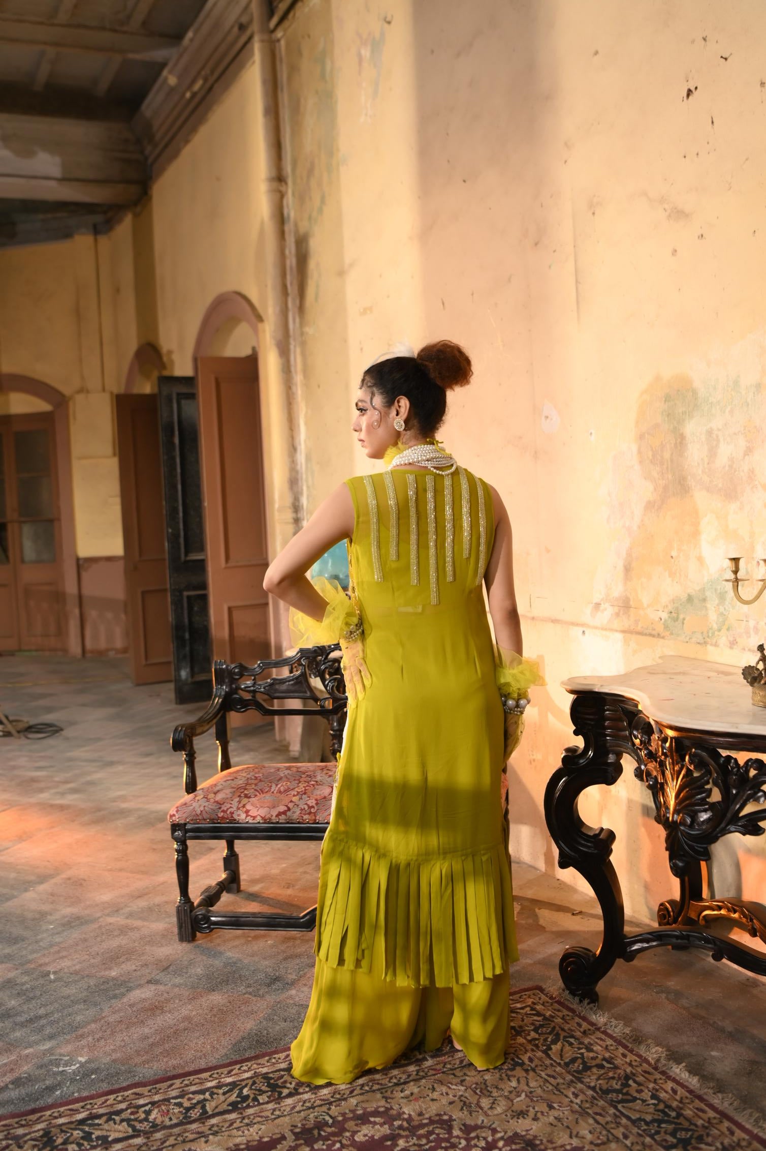 Ornate longline cape with embellished bustier and relaxed flared bottoms.