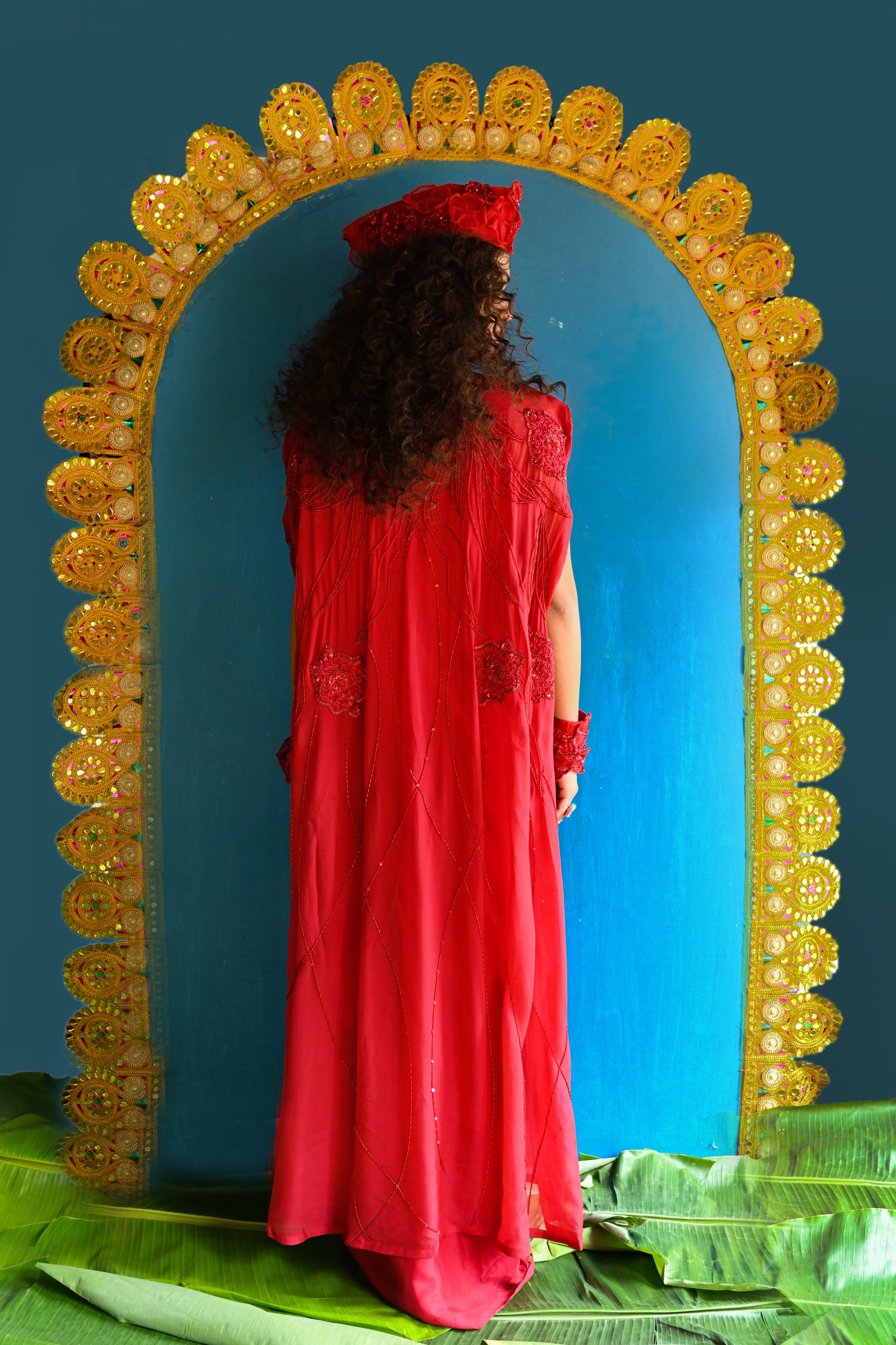 No.of components/pieces in the set: skirt, blouse, drape & cape (4)