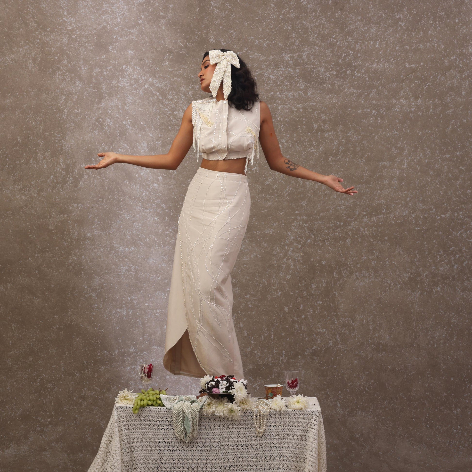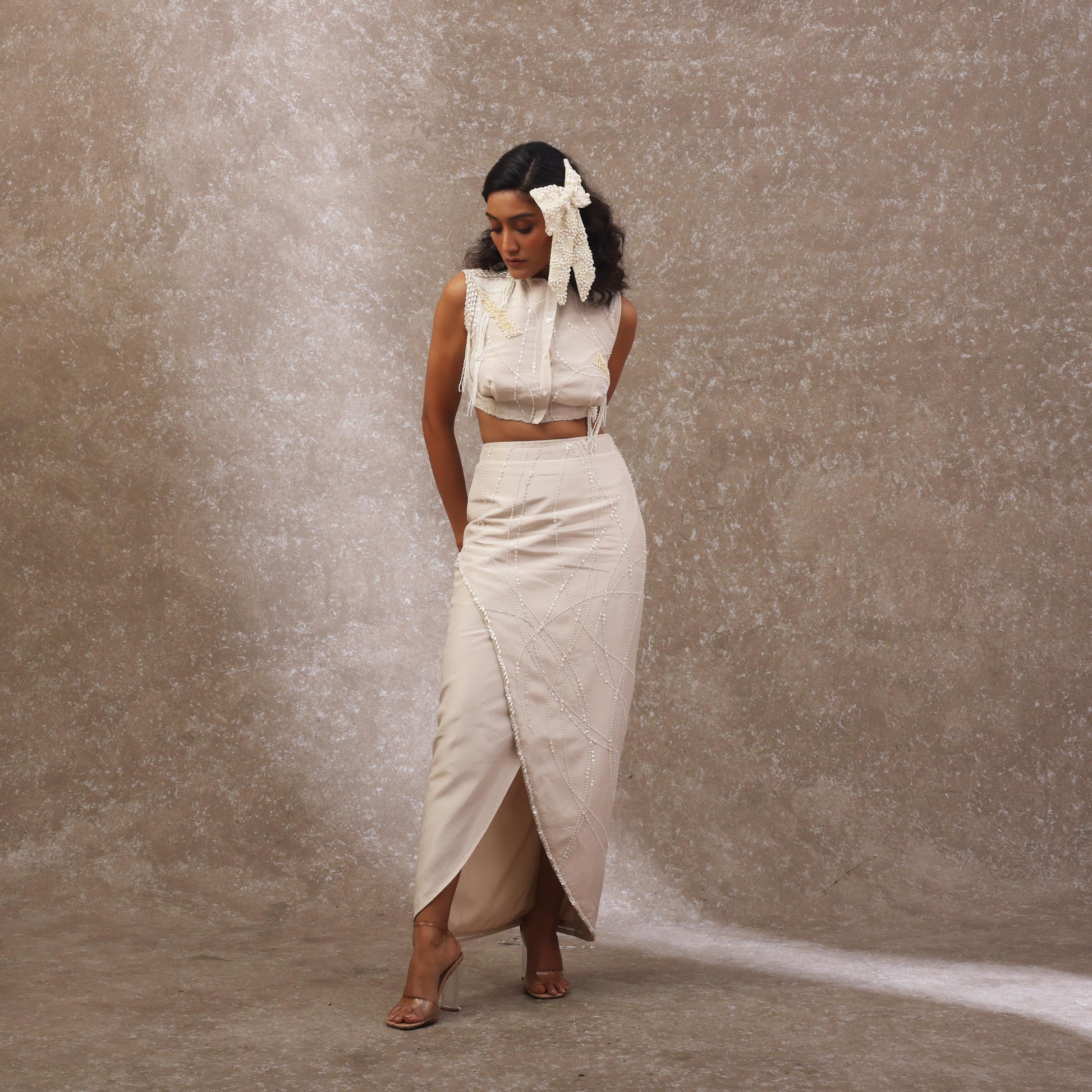 Sleeveless embellished crop top with wrap-style pencil skirt